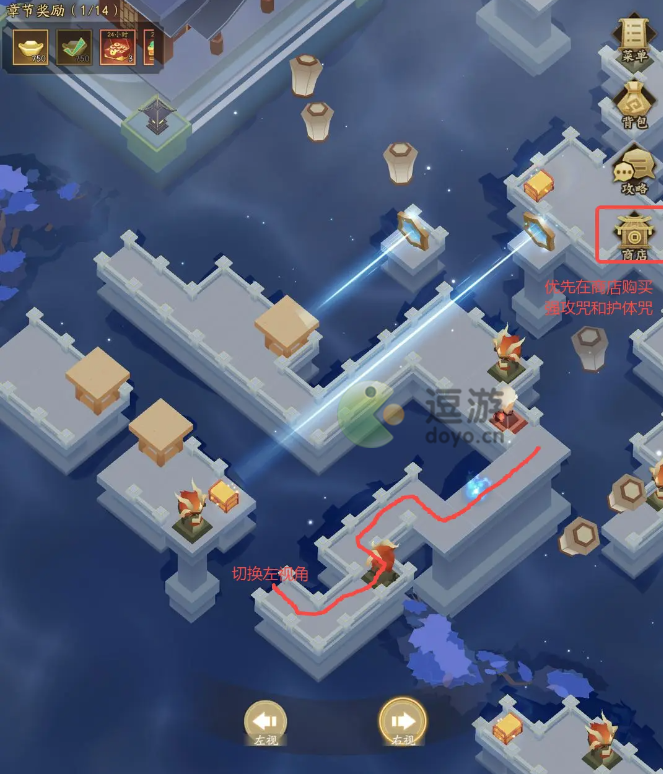 2、第二步:沿图示红线方向前进,拾取剑意后击败敌人,推荐在商店购买强攻咒强化队伍输出。走到尽头后切换左视角,挑战第二波敌人,而后用获取的符纸购买护体咒,提升队伍整体防御力。