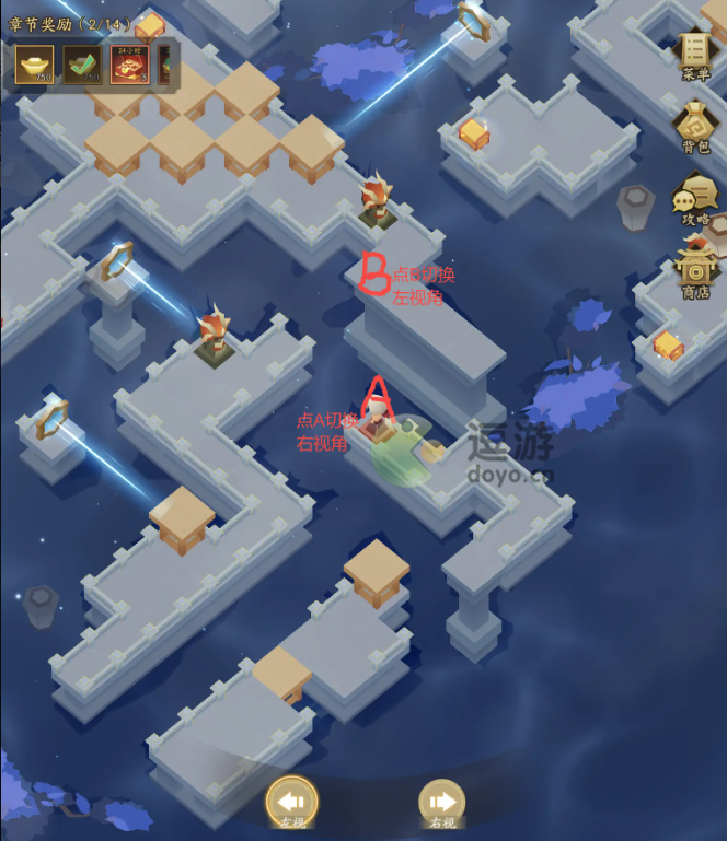 1、第一步:推动箱子,遮挡铜镜光线后领取元宝宝箱奖励,走到A点后转向切换右视角,即可继续探索。