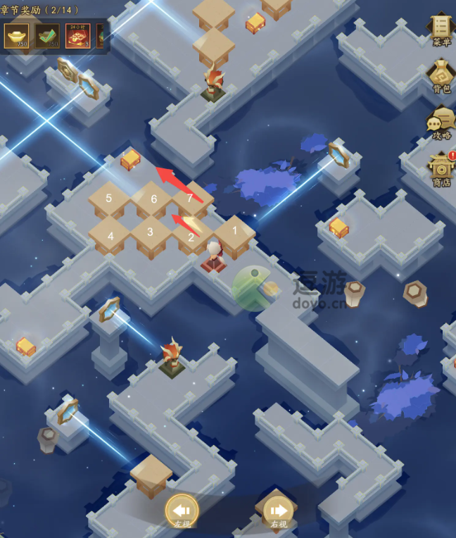 6、第六步:P1击败拦路的敌人后在路的尽头切换右视角,推动8号箱1格再切换左视角,切记勿推到底~击败敌人领取宝箱一条龙。P2重复操作将8号箱推到指定地块,需如来时一样切换左右视角,遮挡两头的光线后即可领取宝箱,这次的奖励是日炎精粹,用于提升角色天相~