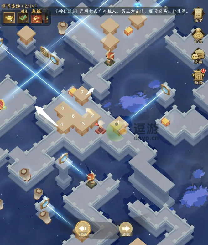 10、第十步:P1来到最后一步啦,坚持下来的道友都太厉害了吧~在主角站立处切换右视角,将18号箱按箭头方向推下,再将19号箱推动到原18号箱处,再按红色箭头推动到18号箱上方遮挡铜镜的光线。P2领取宝箱和最后的剑意,分别将21和20号箱推入地块缝隙,此时如若有多余的符咒可以用来购买更为强力【霸王符】增加气势。击败最后一个敌人后,切换左视角领取最后终极大奖——飞升灵珠*10。